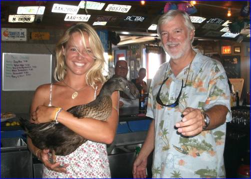 Bernard Johnson in his bar with a lady who Bernard "claims" came into his bar with her duck. |